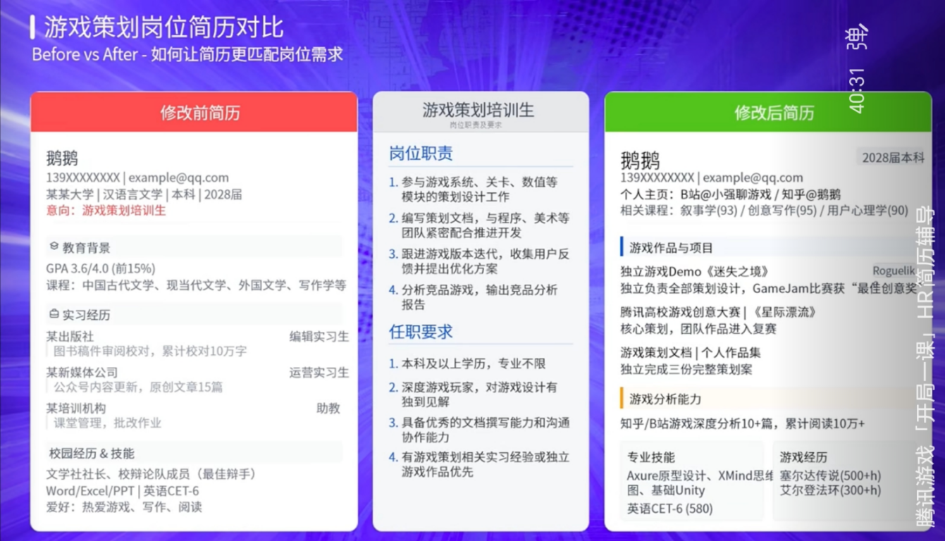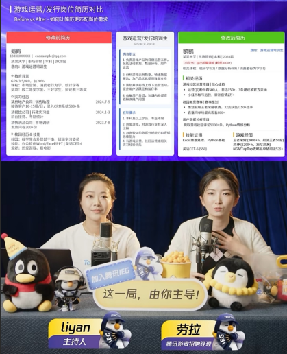 作为游戏行业的领军企业,腾讯游戏此次「开局一课」简历辅导专场聚焦学生求职痛点,针对性破解简历撰写难题。活动伊始,腾讯游戏HR负责人结合多年招聘经验,开篇点明游戏行业简历筛选的核心逻辑:“一份优质的游戏行业简历,既要体现专业硬实力,也要传递对行业的热爱与思考,精准匹配岗位需求才是关键。”随后,专家围绕简历核心模块展开细致讲解,从个人信息规范、自我评价提炼,到教育背景、项目经历、游戏经历的优化呈现,逐一拆解撰写技巧。